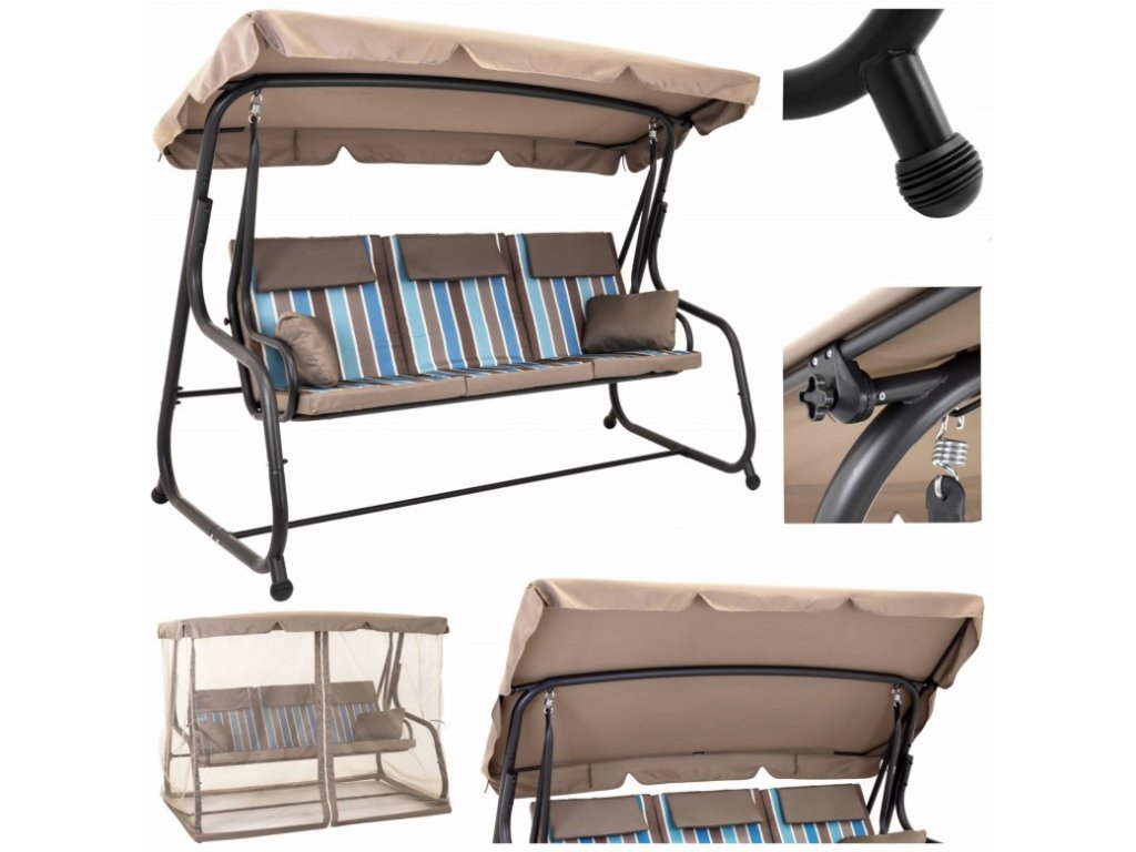 Trojmiestna konštrukcia – priestranná hojdačka pre 3 dospelých Stabilný kovový rám – práškovo lakovaný, odolný voči hrdzi a poveternostným vplyvom Nastaviteľná strieška – chráni pred slnkom a slabým dažďom Moskytiéra na zips – rozopínacia, vyrobená z jemnej sieťoviny, účinne chráni pred komármi a muchami Pohodlné sedadlo – mäkké vankúše vyrobené z odolného materiálu odolného voči nečistotám Funkcia hojdania – jemný, plynulý pohyb pre úplnú relaxáciuDodatočné parametre