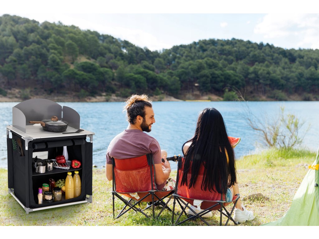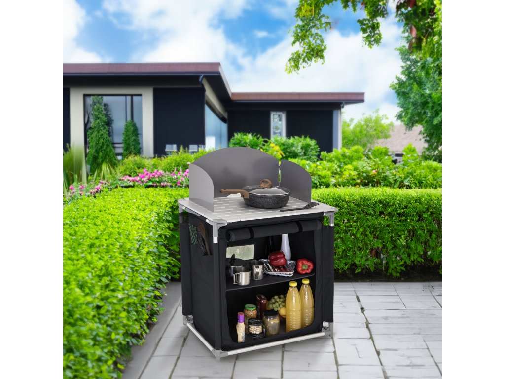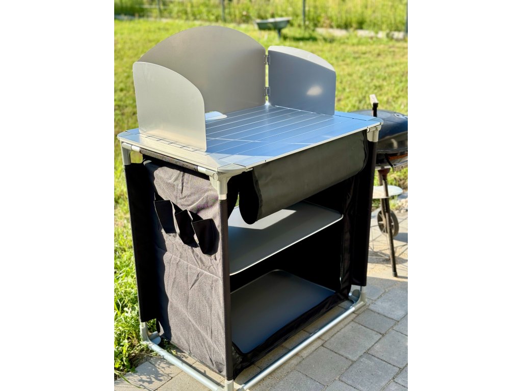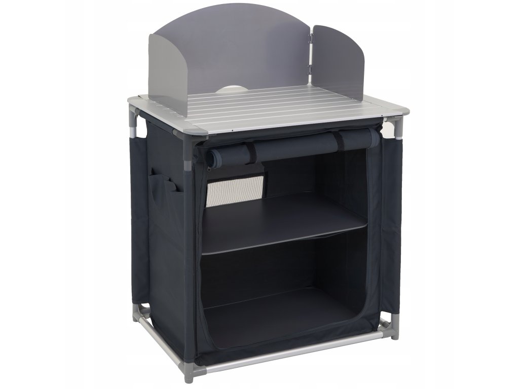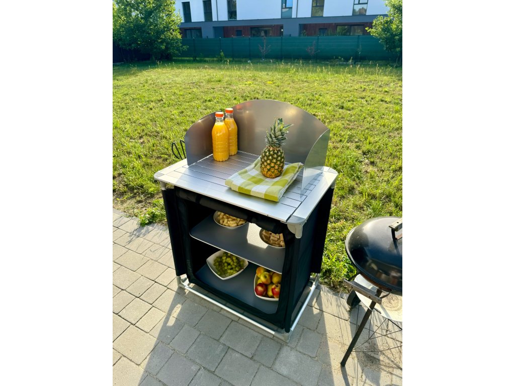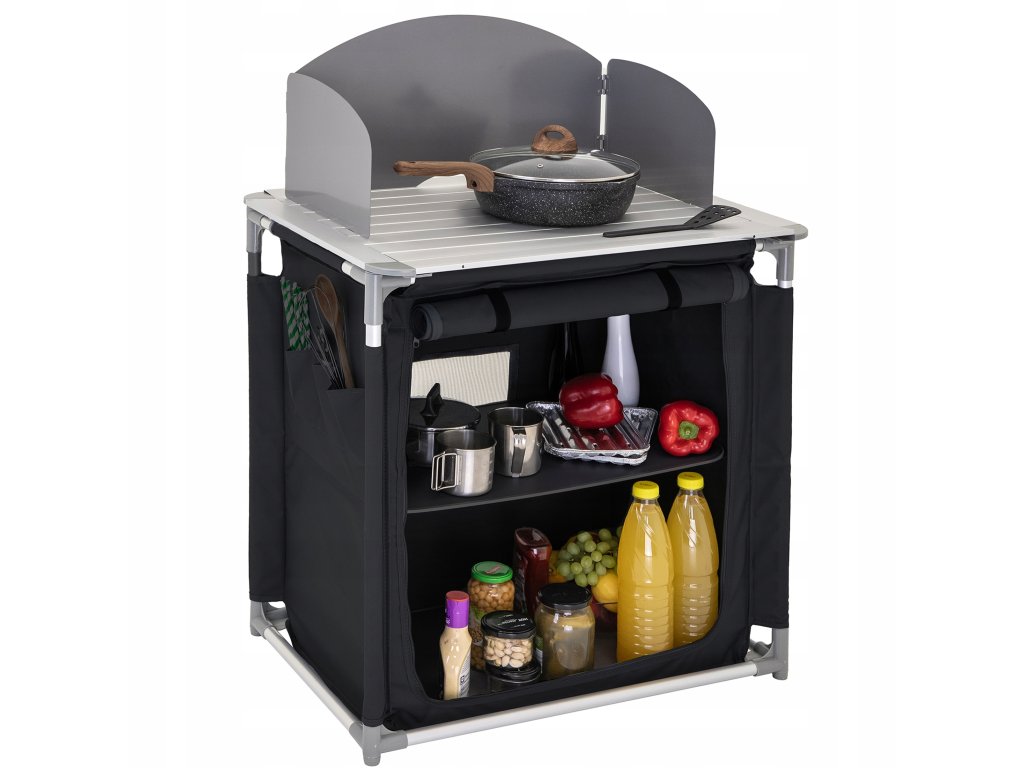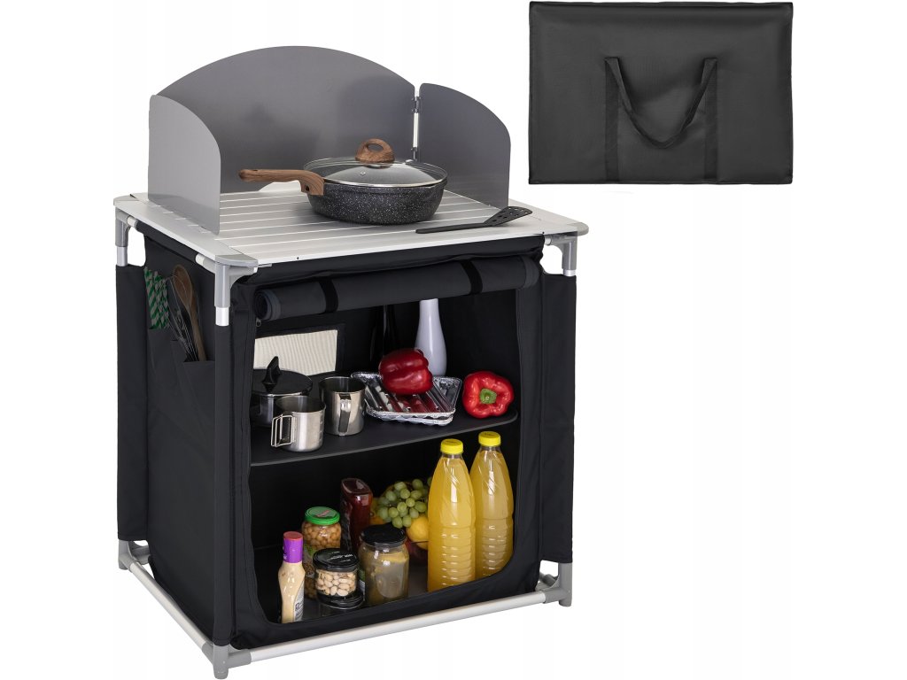 Táto kempingová kuchyňa má kovovú pracovnú dosku, na ktorú možno umiestniť sporák. Súprava obsahuje závesnú skrinku s dvoma tvrdenými policami na uloženie potravín, riadu a ďalších nevyhnutností. Celá kuchyňa je navrhnutá tak, aby sa dala zložiť do praktickej prenosnej tašky, čo uľahčuje jej prepravu a skladovanie, najmä mimo sezóny.Dodatočné parametre