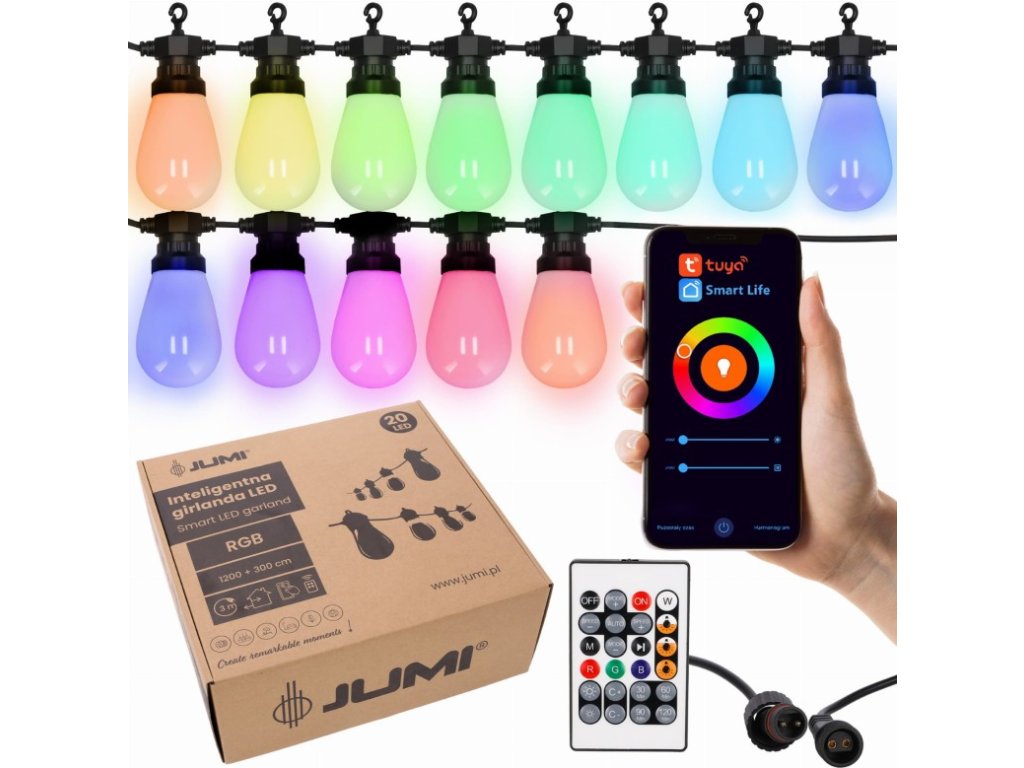 Steruj girlandą LED za pomocą pilota lub aplikacji TUYA SMART na Android i iOS – zmieniaj kolory, jasność, tryby świecenia i ustawiaj harmonogramy. Dzięki aplikacji możesz kontrolować każdą żarówkę osobno, wyłączać je, przypisywać kolory z nieograniczonej palety RGB i wybierać między ciepłym a zimnym światłem. Do dyspozycji masz gotowe sceny, efekty migania i pulsowania oraz możliwość tworzenia własnych sekwencji świetlnych. Pilot umożliwia szybki wybór koloru, trybu, jasności i ustawienie timera – bez sięgania po telefon. Aplikacja wspiera sterowanie głosowe przez Alexę i Asystenta Google. Trwała, wodoodporna i energooszczędna (tylko 6 W na 20 LED) girlanda idealnie sprawdzi się na zewnątrz przez cały rok. Zasilanie: 220-240 V Zasilanie girlandy: 12 V Moc: 8,4 W Ilość diod LED: 20 szt Długość przewodu zasilającego: 300 cm Długość części świetlnej: 1200 cm Klasa ochrony: IP44 dla samej girlandy IP65Dodatočné parametre