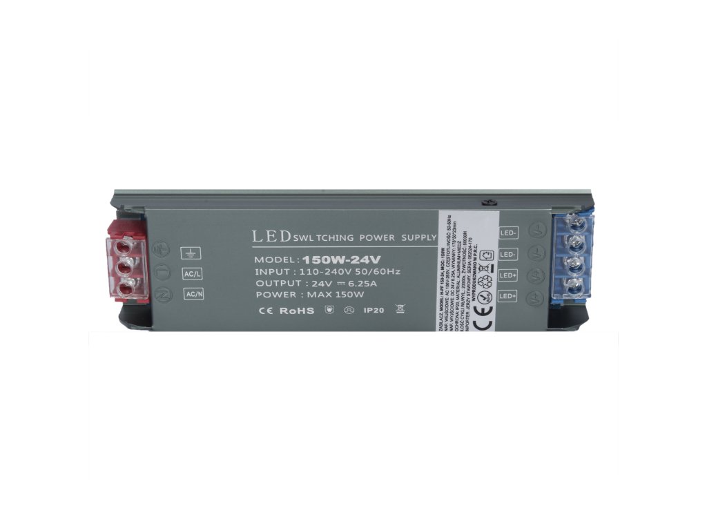 Zariadenie poskytuje stabilné výstupné napätie 24 V DC s maximálnym prúdom 6,25 A, čo umožňuje napájať väčšie inštalácie LED pásikov s vysokou spotrebou energie. Široký rozsah vstupného napätia 100 – 265 V AC robí z napájacieho zdroja univerzálne a bezpečné riešenie pre rôzne elektrické siete.
