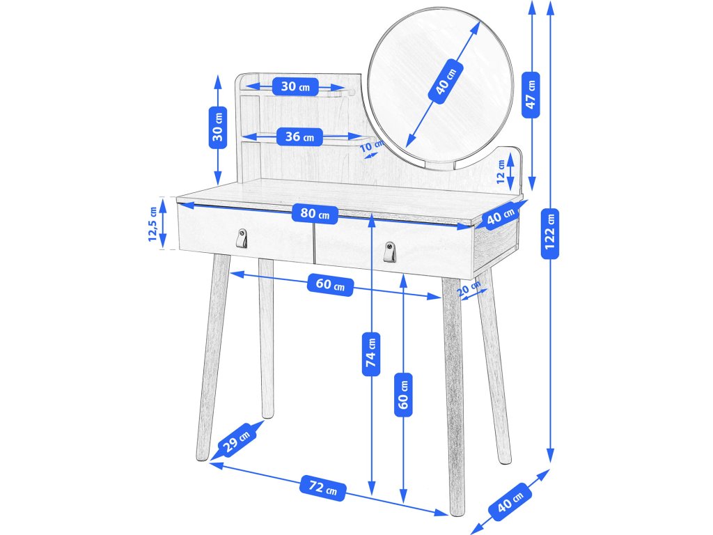 OPTIMÁLNE a PRAKTICKÉ VYUŽITIE zásuvky, ideálne na kozmetiku, šperky, účtenky, písacie potreby a všetky možné drobnosti, ktoré konečne nájdu svoje miesto, praktické police na predmety dennej potreby, ako je krém na ruky, nádoba so štetcami na púder, parfumy, vlasové doplnky, pracovná doska, umožňuje vám tiež použiť toaletný stolík ako písací stôl, zrkadlo, vďaka ktorému si môžete starostlivo skontrolovať účes a make-up zo všetkých strán, praktický priestor na zasunutie stoličkyDodatočné parametre