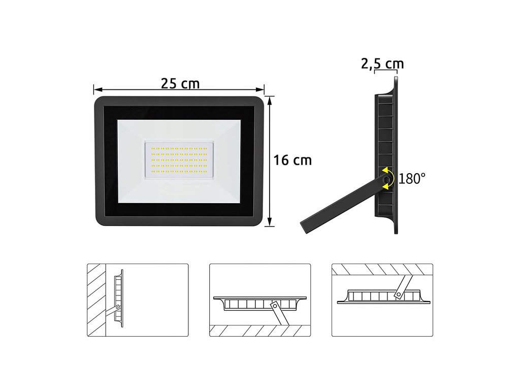 Popis 50W SuperLED PREMIUM PARAMETER LED reflektor - reflektory s najmodernejšou LED technológiou. Najodolnejšie a najodolnejšie. Poskytujú skutočné svetelné parametre a NAJVYŠŠÍ SVETELNÝ VÝKON! Výrobca: SuperLED Farba: čierna Stupeň krytia: IP65 / hermetický Svetelný tok: 5500 lúmenov Ekvivalent tradičného reflektora: ~500W Farba svetla: studená biela (6000K) SuperLED Plus: Produkt s predĺženou životnosťou výrobcu Výkonný. Bezpečný. Odolný v prevádzke Vysokokvalitný SuperLED LED reflektor v pevnom a odolnom puzdre. Vďaka použitiu SMD diód je výkon žiarovky rovnomerne rozptýlený medzi SMD diódy - vyžarujú rovnomerné, čisté svetlo. Okrem toho, svetelný zdroj nie je sústredený na jednu COB diódu, ako je to v prípade iných reflektorov. Vďaka tomu sú SMD reflektory spoľahlivé a odolné. Vďaka vysoko kvalitnému práškovo lakovanému povrchu a skrutkovému spoju z nehrdzavejúcej ocele je reflektor odolný voči dažďu a snehu. Technická špecifikácia: výrobca: SuperLED Poľsko konštrukcia: hliník + tvrdené sklo diódy: SMD 2835 farba: čierna farba svetla: studená biela (6000K) výkon: 50W svetelný tok: 5500 lm napájanie: 220-240V AC frekvencia: 50/60 Hz index podania farieb CRI: Ra>80 trieda vodotesnosti: IP65 životnosť: ~30000h počet spínacích cyklov: ~20000 prevádzková teplota: (-25°C až 45°C) uhol vyžarovania: 120 stupňov šírka: 165 mm výška: 117 mm hrúbka: 24 mm dĺžka kábla: ~150 mm certifikáty: CE, RoHS SuperLED reflektory sú ideálne na použitie v: skladoch garážach dielňach stravovacích zariadeniach športových ihriskách priemyselných halách kotolniach obchodoch parkoviskách štadiónoch domácnostiachBuďte prvý, kto napíše príspevok k tejto položke.
