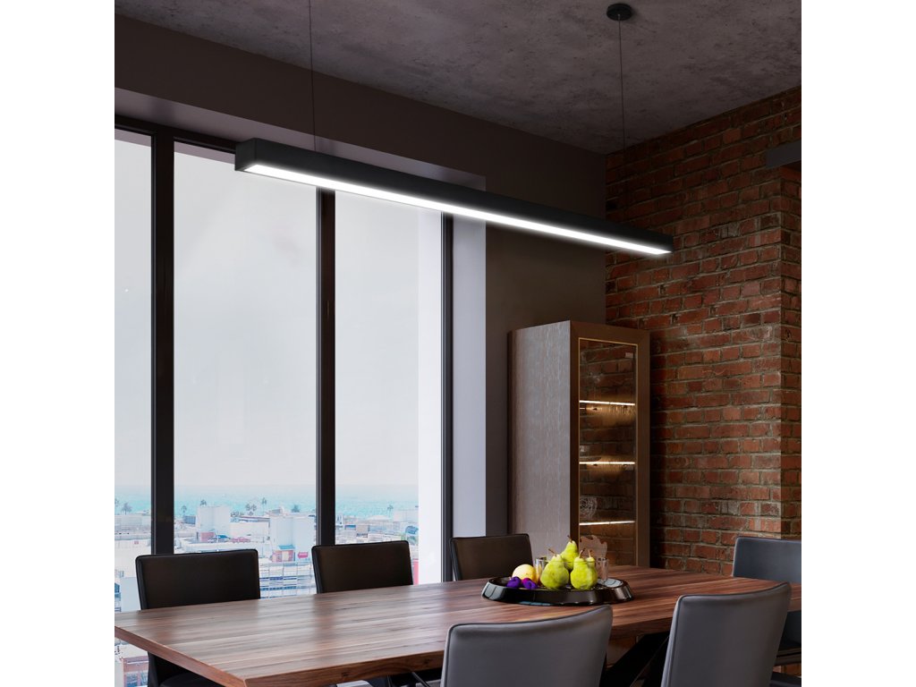 Lineárne kancelárske závesné svietidlo Ideálne do kancelárií, škôl, skladov, ako aj do obytných priestorov. Puzdro je vyrobené z hliníka, takže teplo sa lepšie rozptyľuje - čo ovplyvňuje životnosť. Rám je práškovo lakovaný čiernou farbou, matný povrch.