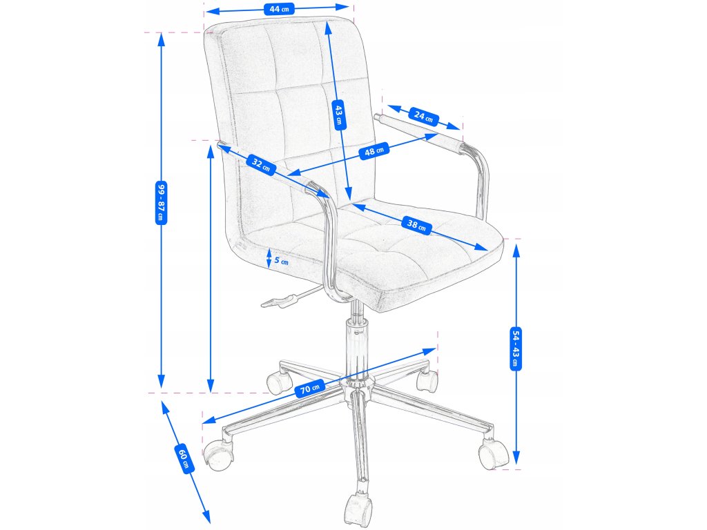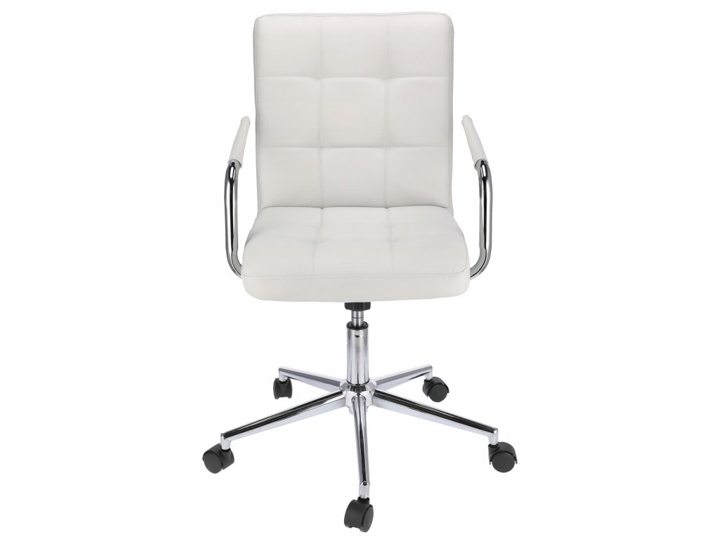 Stolička má sedadlo čalúnené ekokožou so štvorcovým prešívaním. Päťramenná základňa s malými kolieskami poskytuje vynikajúcu stabilitu a chráni povrch pred poškriabaním. Stolička má pohon, ktorý umožňuje nastaviť výšku sedadla podľa vašich potrieb. Stolička je vybavená systémom TILT, ktorý umožňuje posúvať a nakláňať celé sedadlo dozadu.Dodatočné parametre
