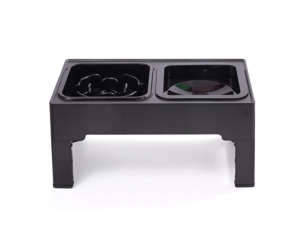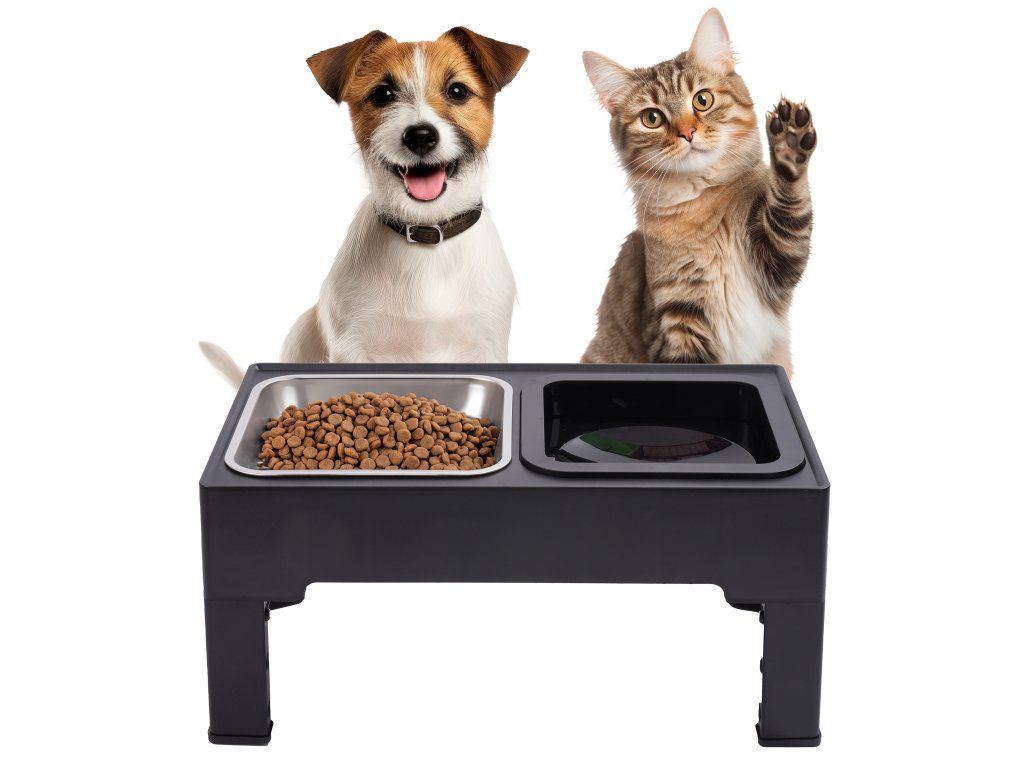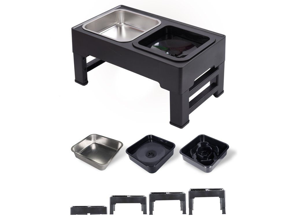 Misky sú vyrobené z nehrdzavejúcej ocele; sada obsahuje misku bez rozlievania a misku s pomalým dúškom, ktoré umožňujú vášmu domácemu miláčikovi zdravo tráviť jedlo. Miska s pomalým dúškom má výstupky, okolo ktorých je krmivo rozložené. To umožňuje vášmu domácemu miláčikovi jesť pomalšie a v menších množstvách. Miska na vodu je naopak miska bez rozlievania. Má špeciálne dno, ktoré sa zdvíha so stúpajúcou vodou, čo núti vášho domáceho maznáčika piť menšie a pomalšie dúšky. Nastavenie výšky vám umožňuje prispôsobiť sadu veľkosti vášho domáceho maznáčika a zároveň rešpektovať jeho držanie tela a zabrániť nadmernému ohýbaniu krku. Misky sú odnímateľné, vďaka čomu sa ľahko udržiavajú v čistote. Základňa je stabilná a odolná a jej farba im dodáva veľmi klasický vzhľad. Majú tiež protišmykové dno, ktoré zabraňuje prevráteniu vášho domáceho maznáčika. Ich dizajn doplní akýkoľvek interiér.Dodatočné parametre