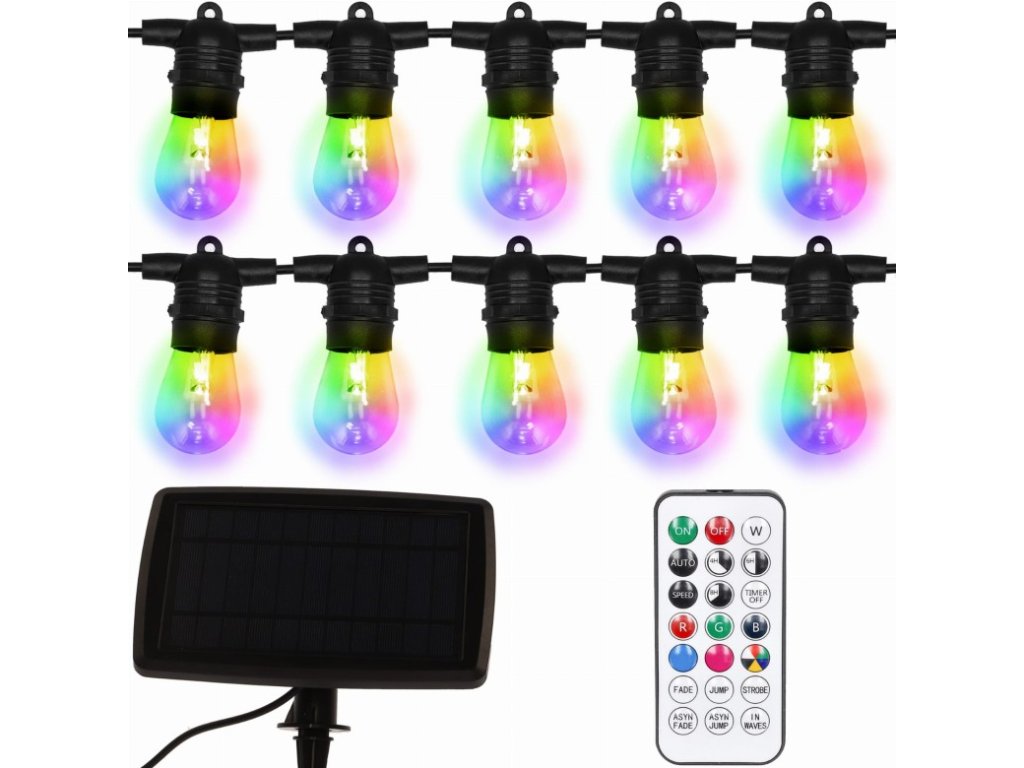 RGB LED diódy – svietia v mnohých farbách Diaľkové ovládanie – menia farby, režimy a jas bez nutnosti pohnúť sa z miesta Solárna energia + batéria s kapacitou 3600 mAh – nulová spotreba elektriny, maximálne pohodlie 10 LED žiaroviek – úsporné a s dlhou životnosťou Rozstup 100 cm + dlhý napájací kábel – ideálne do väčších priestorov Odolné voči striekajúcej vode (IP44) – bezpečné vonkajšie použitie Skvelá dekorácia na každú príležitosť – svadby, grilovačky, sviatky, večery s priateľmi Moderný a solídny dizajn – nielenže svieti, ale aj vyzerá elegantneDodatočné parametre