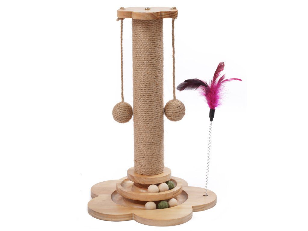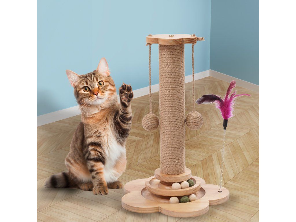 Drevená základňa robí škrabadlo mimoriadne odolným a stabilným. Je vybavené dvoma závesnými loptičkami na šnúrkach, šiestimi menšími loptičkami, ktoré sa kotúľajú po základni, a farebným pierkom stojacim na základni, vďaka čomu je toto škrabadlo nezabudnuteľnou hračkou. Toto množstvo hračiek umožňuje vašej mačke hrať sa celé hodiny bez toho, aby sa nudila. Takéto škrabadlo je kľúčové pre udržiavanie hygieny mačacích pazúrov a ich pravidelné brúsenie. Tiež to odvedie vašu mačku od škrabania nábytku alebo osobných vecí.Dodatočné parametre