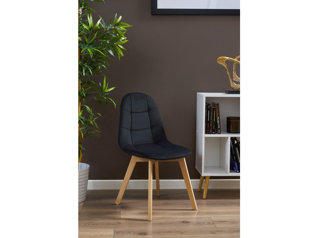 Táto stolička z kolekcie COLIN sa vyznačuje mäkkým a odolným sedadlom potiahnutým zamatovým velúrom. Je husto polstrovaná a jej operadlo má pohodlný tvar, ktorý dokonale podopiera chrbát. Drevené nohy vyrobené zo svetlého buka zaisťujú stabilitu a odolnosť.Dodatočné parametre