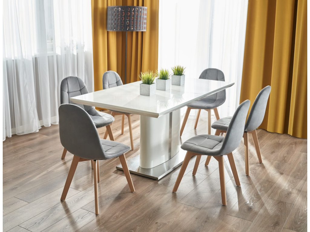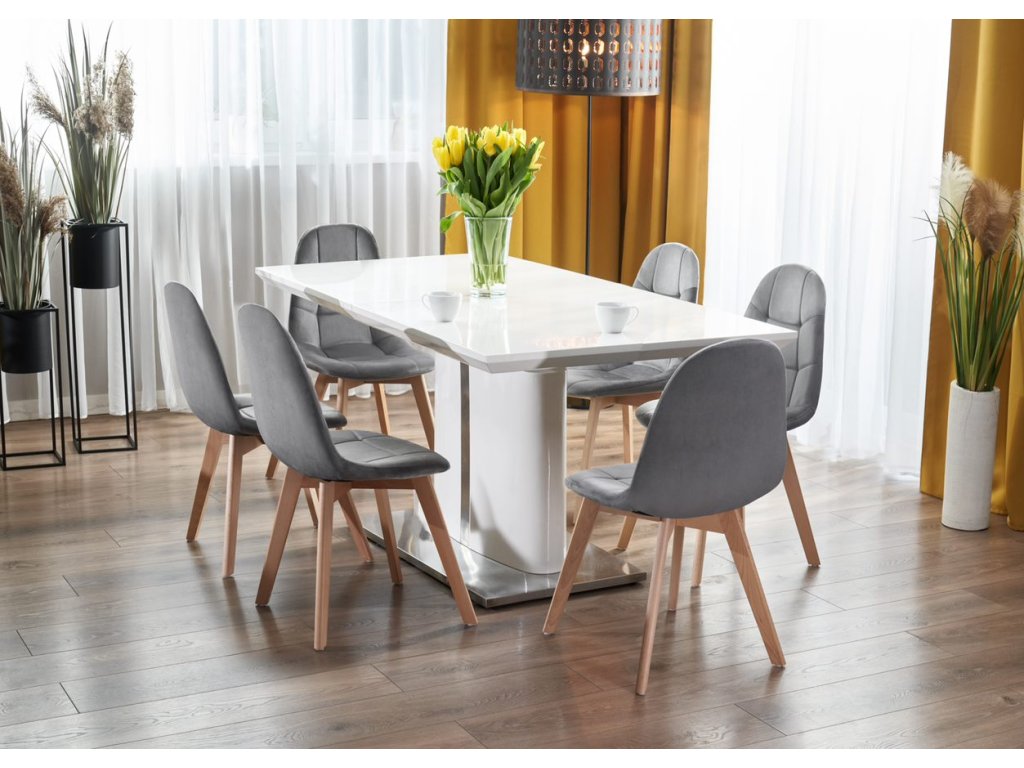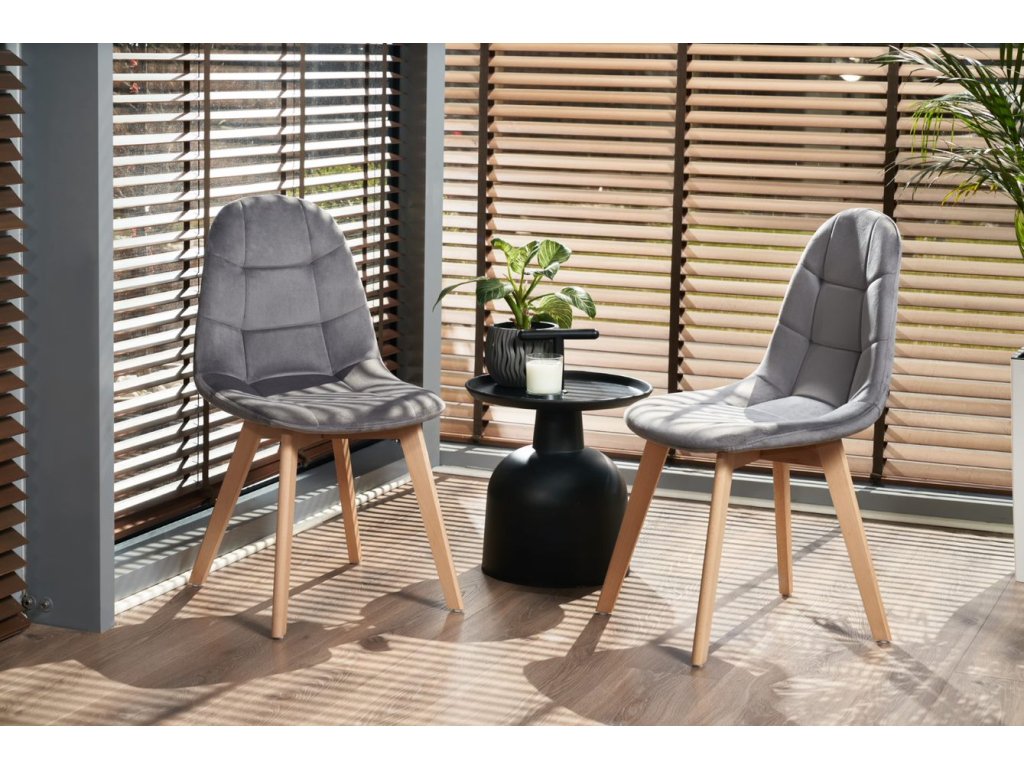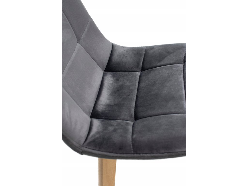 Táto stolička z kolekcie COLIN sa vyznačuje mäkkým a odolným sedadlom potiahnutým zamatovým velúrom. Je husto polstrovaná a jej operadlo má pohodlný tvar, ktorý dokonale podopiera chrbát. Drevené nohy vyrobené zo svetlého buka zaisťujú stabilitu a odolnosť.Dodatočné parametre