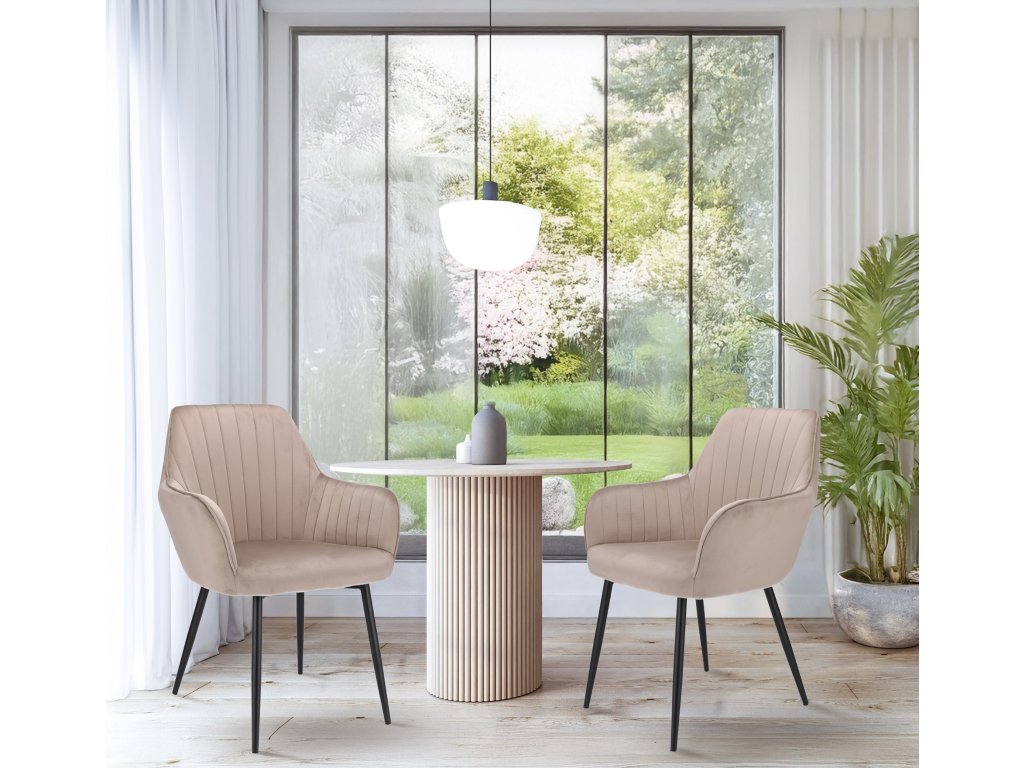 Stolička z kolekcie CORA Pevná, zamatová stolička vybavená mäkkým sedákom a vysokým operadlom s ozdobným prešívaním. Celé to pôsobí ľahko vďaka štíhlym čiernym nožičkám, ktoré dodávajú vizuálnu ľahkosť a zároveň zaisťujú dokonalú stabilitu. Výška operadla, podrúčky a jej mäkkosť robia stoličku neskutočne pohodlnou.Dodatočné parametre