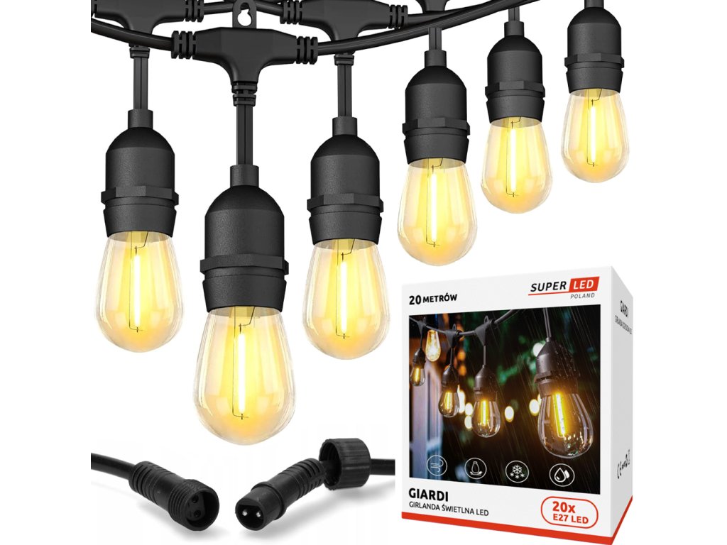 Záhradná svetelná girlanda SuperLED Giardi 20 metrov + 20 kusov teplých žiaroviek E27 1W Vlastnosti produktu: 20-metrová girlanda s objímkami rozostupmi každých 90 cm 20 svetelných bodov možnosť kombinovania girland vďaka hermetickým konektorom kábel: HO5RN-F 2x1mm, vysoká svetelná účinnosť: 80 lúmenov x 20W girlanda prispôsobená nepriaznivým poveternostným podmienkam (dážď, sneh, krupobitie) vysoký stupeň tesnosti - IP44 prispôsobené žiarovkám energetických tried A++ - E. sada s 20 ks LED žiaroviek SuperLED E27 1W teplé, žlté svetlo s teplotou farby 2700K, ktoré vytvára útulnú atmosféru pripravené na zavesenie a svietenie! Vytvorte si nezabudnuteľnú atmosféru vo svojej záhrade Záhradná girlanda SuperLED Giardi sa skvele hodí ako na vonkajšie podujatia, tak aj na každodenné použitie a vytvára dokonalú atmosféru na relaxáciu. Je vyrobená z najkvalitnejších materiálov. Vďaka girlandám vytvoríte jedinečnú atmosféru a špeciálnu atmosféru doma, v záhrade, na terase, vonku, na svadbe, firemnej akcii a na mnohých ďalších miestach. Špecifikácie produktu: Výrobca: SuperLED Farba: ČIERNA Čistá hmotnosť: 2 kg Frekvencia napätia: 50Hz Trieda ochrany pred úrazom elektrickým prúdom: Druhá trieda ochrany Trieda ochrany pred prenikaním prachu a vlhkosti: IP44 Miesto použitia: V interiéri aj exteriéri Spôsob montáže: Strop Pätica: E27 LED Napájanie: Prispôsobené na 230V Súlad so smernicami Európskej únie (CE): Áno Kábel najvyššej kvality. Možnosť predĺženia: Girlandy Giardi sú vybavené káblom 2x1 mm H05RN-F zakončeným 2-pinovým konektorom na každom konci. Káble H05RN-F je možné nechať vonku, aj v zime. Navyše, vďaka hermetickým 2-pinovým konektorom môžete spojiť viacero reťazí dohromady! Súčasťou balenia sú SuperLED LED žiarovky Výrobca: SuperLED Model žiarovky: E27 filament 1W Farba žiarovky: priehľadná (sklo) Farba svetla: teplá (2700K) Výkon: 1W Svetelný tok: 80lm Napájacie napätie: 220-240V AC Priemer: Výška: Uhol svetla: 270 stupňov Index podania farieb CRI: Ra>80 Počet cyklov zapnutia/vypnutia: 50000 Životnosť: 30000h Certifikáty: CE, RoHS Zaveste podľa vlastného uváženia Vďaka dodatočným háčikom pre každú žiarovku Výberom kúpy SuperLED girlandy získate vysokokvalitný produkt, ktorý uspokojí potreby každého zákazníkaBuďte prvý, kto napíše príspevok k tejto položke.