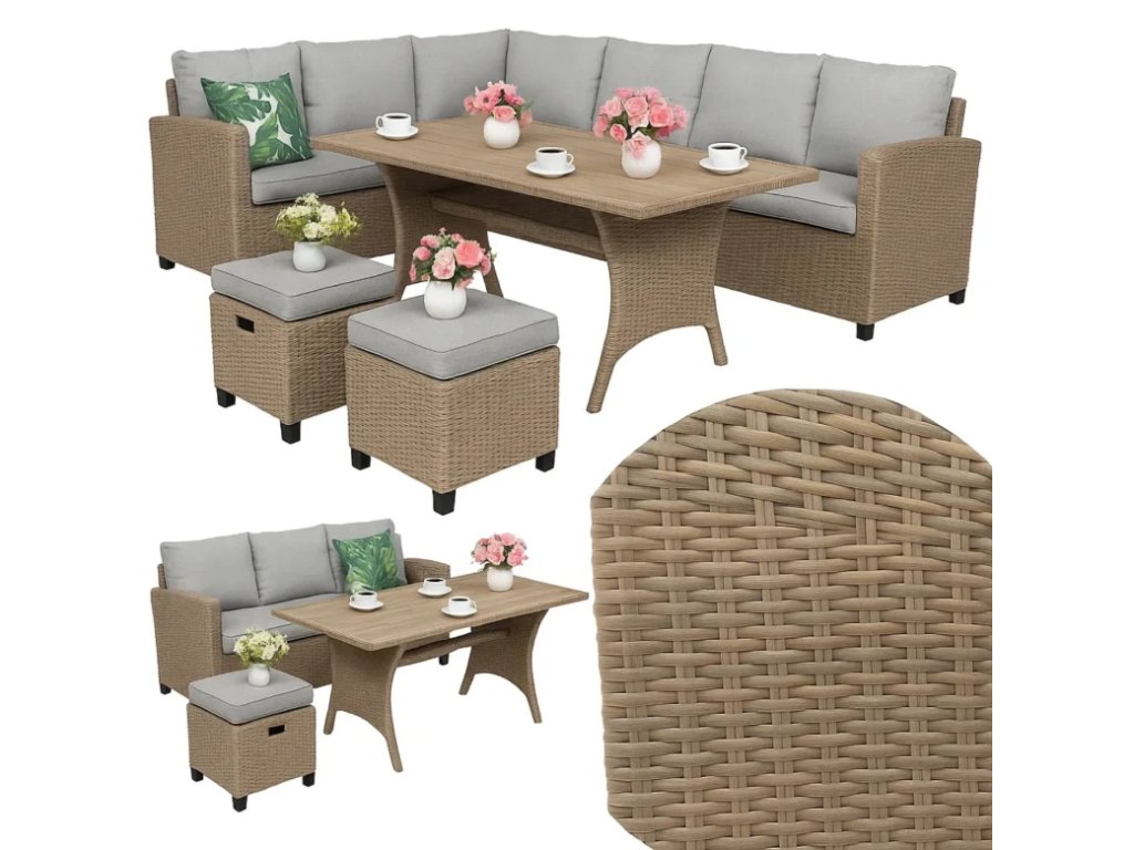 Záhradná súprava „BIANCA“ Vďaka použitiu PE ratanu, odolného voči poveternostným vplyvom a vode, sa táto súprava ľahko čistí, je odolná a vhodná na každodenné použitie. Jej pevné oceľové komponenty sú mimoriadne trvácne. Nohy nábytku sú vyrobené z materiálu imitujúceho drevo a rohová pohovka je modulárna a ľahká, takže sa dá ľahko premiestňovať a prispôsobiť akémukoľvek prostrediu. Hrubé vankúše a pevné pufy zaručujú pohodlie. Farba: béžová Môžete ju použiť ako rohovú pohovku s pufmi alebo ju rozložiť a vytvoriť tak dve pohovky a dva pufy. DETAILY - NA KTORÝCH ZÁLEŽÍ: Venujte pozornosť: vhodne tvarovaným operadlom, tieňovaniu, presnému výberu farieb, imitácii starých farieb - vytvára efekt prírodného ratanu, mimoriadne hrubé vankúše zaručujú jedinečný relax, vysoko kvalitnému tkaniu. VENUJTE POZORNOSŤ KVALITE RATANU! Nepoužívame plochý technoratan, ale polkruhový, textúrovaný tvar - krásne imitujúci prírodný ratan. POVLAKY NA VANKÚŠE SÚ NA ZIPSY! Môžete ich vybrať a vyprať.Dodatočné parametre