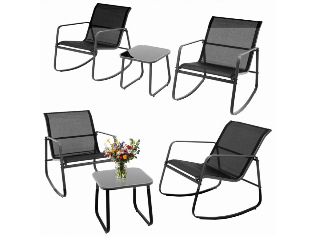 Moderný dizajn – dokonalá kombinácia funkčnosti a estetiky Pohodlie používania – jemne hojdacie kreslá sú perfektným spôsobom relaxu vonku Materiál Textilén – vzdušný, odolný voči UV žiareniu a vlhkosti Oceľová konštrukcia – stabilná, rám s práškovou farbou odolný voči korózii Doska stola z tvrdeného skla – odolná voči poškriabaniu a ľahko sa čistíDodatočné parametre